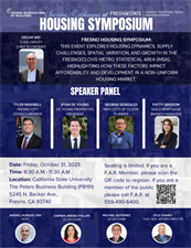 The Fresno Housing Symposium is hosted by the Fresno Association of REALTORS® in collaboration with the Gazarian Real Estate Center at California State University, Fresno. We will bring together leading experts, policymakers, and industry professionals to explore the dynamics shaping our regional housing market. This symposium will dive into critical topics such as housing supply challenges, spatial variations, and growth patterns within the Fresno/Clovis Metropolitan Statistical Area (MSA). Together, we’ll examine how these factors influence affordability, development, and the future of housing in our evolving community. We are honored to feature Oscar Wei, Deputy Chief Economist with the California Association of REALTORS®, who will share key insights into market trends and data shaping California’s housing outlook. Following his address, our distinguished speaker panel — including Councilmember Tyler Maxwell, Ryan De Young, George Gonzalez, and Patty Grissom — will offer diverse perspectives on how local policies, planning efforts, and financial frameworks can help meet the region’s housing needs. This discussion is designed to foster collaboration, spark innovation, and move us toward solutions for a stronger, more sustainable housing future in the Central Valley. Let’s get started on this important conversation about building homes, communities, and opportunities for all.