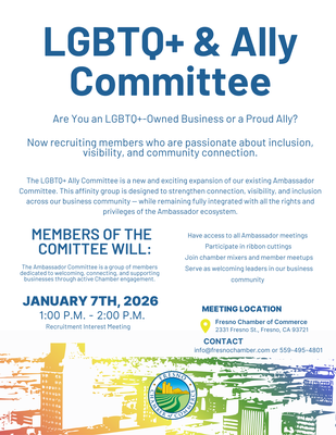 The Fresno Chamber of Commerce is proud to launch our new LGBTQ+ & Ally Committee, an affinity group dedicated to strengthening inclusion, visibility, and community connection within our business community. This committee is an expansion of our Ambassador program and offers all the same rights, privileges, and opportunities — with a focused commitment to fostering a more welcoming and representative Chamber. Our monthly meetings will bring together members who are passionate about supporting LGBTQ+-owned businesses, uplifting allies, and creating a stronger, more connected Fresno. Committee Members Will Have the Opportunity To: Monthly Meeting Details: Whether you’re an LGBTQ+-owned business or a proud ally, this committee is a space to connect, collaborate, and help shape a more inclusive Fresno business environment. For questions or to get involved, please contact info@fresnochamber.com